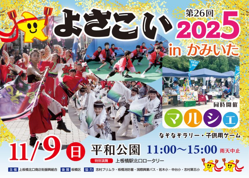 上板橋の秋を彩る恒例イベント「よさこい2025 in かみいた」が、今年も熱く開催されます。カラフルな衣装と力強い踊りが魅力のよさこい演舞が、平和公園と上板橋駅北口ロータリーを舞台に繰り広げられます。地域の商店街によるマルシェや、なぞなぞラリー、子ども向けゲームなども同時開催され、家族連れでも楽しめるにぎやかな一日になりそうです。